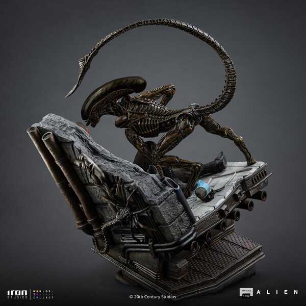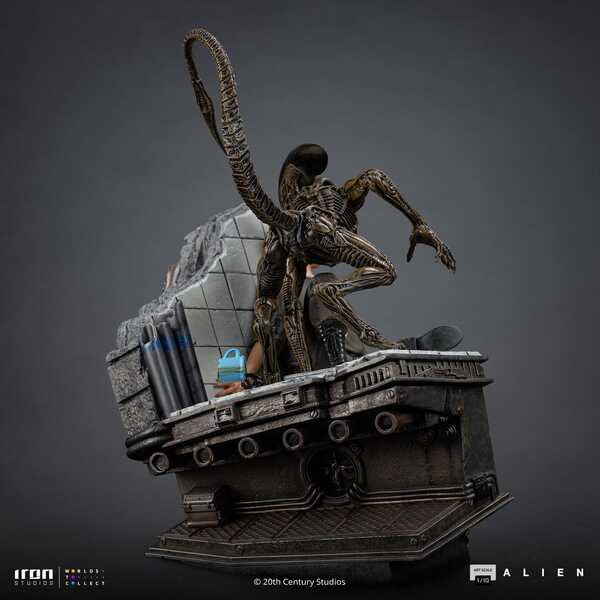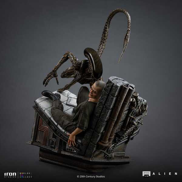 La mise en peinture sublime les détails du costume, les expressions du visage et les textures organiques du Xénomorphe, tandis que le socle thématique complète l'ambiance sombre caractéristique de la saga. Une pièce saisissante pour les fans d'Alien et les collectionneurs de cinéma.