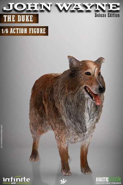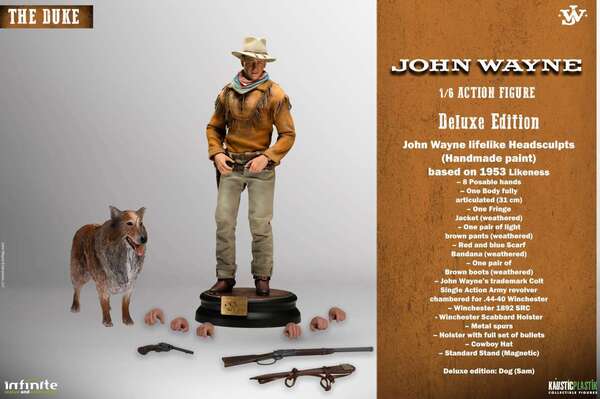 Fabriquée à la main et peinte à la main avec un soin méticuleux et de grands détails, cette figurine articulée est à l’échelle 1/6, avec des vêtements en tissu et comprend des accessoires et des pièces interchangeables. Accessoires : – Un corps entièrement articulé (31 cm) – 8 mains mobiles – Un corps entièrement articulé (31 cm) – Une veste à franges (patinée) – Un pantalon marron clair (patiné) – Bandana foulard rouge et bleu (patiné) – Une paire de bottes brunes (patinées) – Le revolver Colt Single Action Army de John Wayne chambré pour .44-40 Winchester – Winchester 1892 SRC - Étui à fourreau Winchester – Éperons métalliques – Étui avec ensemble complet de balles – Chapeau de cow-boy – Support standard (magnétique) Version Deluxe : Chien (Sam) Par Infinite Statue