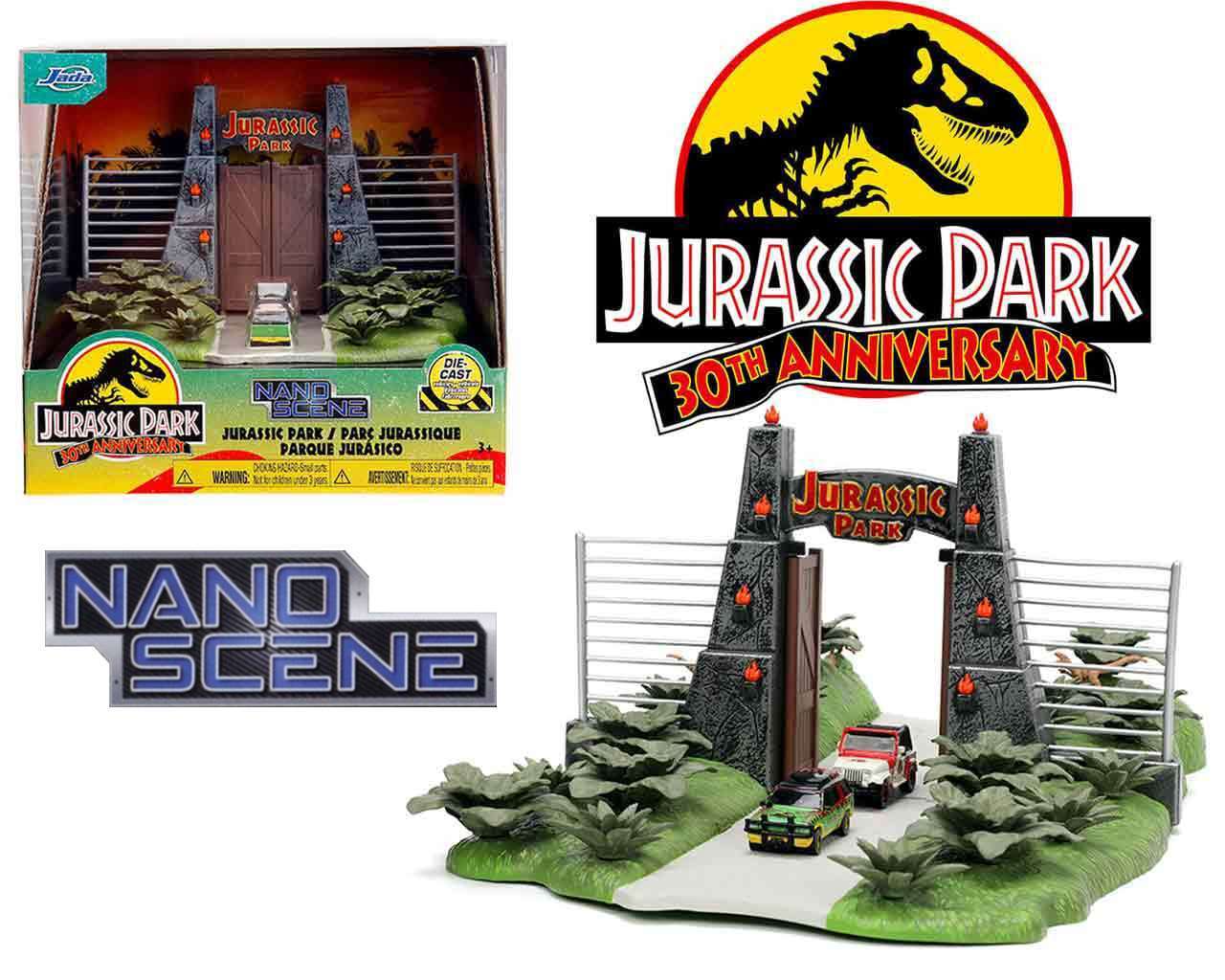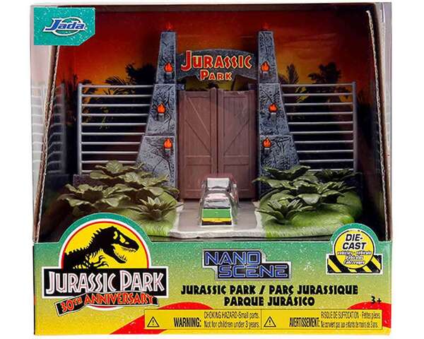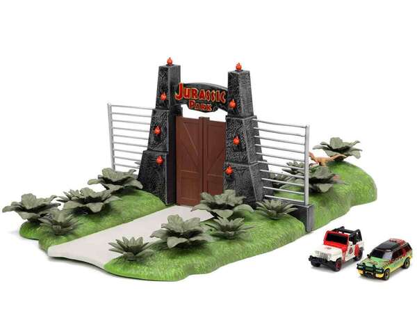 Ce diorama représente la porte d'entrée emblématique de Jurassic Park. Comprend deux véhicules en métal moulé.