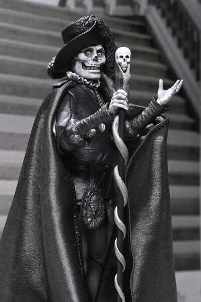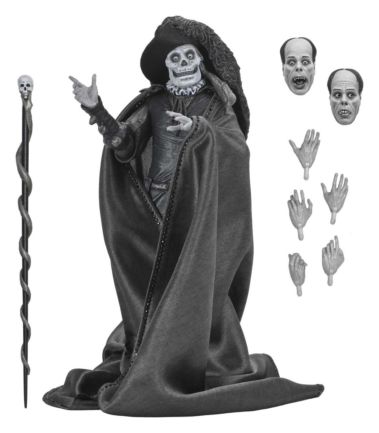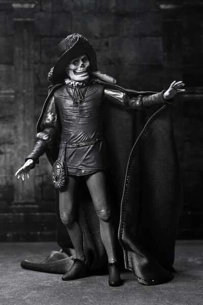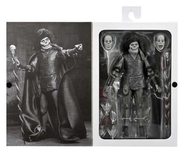 Cette pièce de collection comprend une cape en tissu, un chapeau à larges bords et un sceptre à tête de mort. Elle est également fournie avec plusieurs têtes et mains interchangeables avec les autres figurines du Fantôme de l'Opéra de NECA (vendues séparément). Présentée dans une boîte fenêtre pour collectionneurs avec un rabat frontal, cette figurine est un incontournable pour les fans d'horreur et les amateurs de cinéma classique !