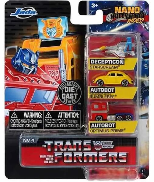 Ces modèles en métal moulé sous pression, extrêmement détaillés, d’Optimus Prime, Bumblebee et Starscream proviennent directement de la série animée des années 1980 et mesurent chacun environ 4 centimètres.
